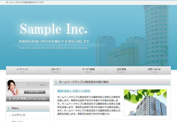 メイン画像のスペースを大胆に配置したインパクトのあるデザインテンプレートです。使いやすいデザインですので様々な用途でご利用頂けるホームページテンプレートです。