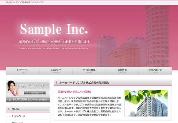 メイン画像のスペースを大胆に配置したインパクトのあるデザインテンプレートです。使いやすいデザインですので様々な用途でご利用頂けるホームページテンプレートです。
