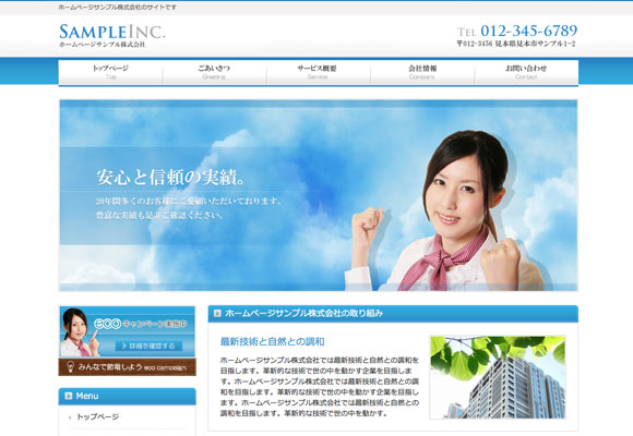 スタンダードなデザインで特に人気のあるホームページテンプレートです。好印象を与えるデザインですので企業サイトに最適なホームページテンプレートです。