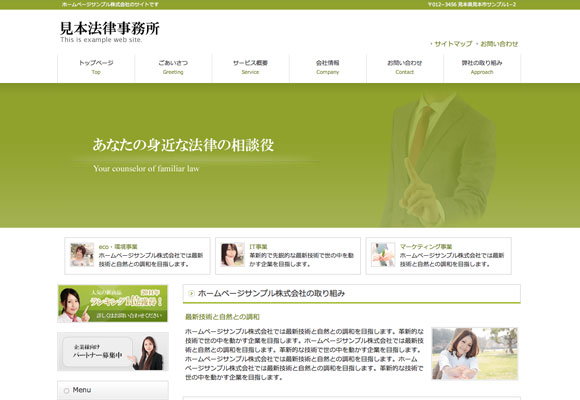 非常にクリアで引き締まったデザインで、法律事務所や税理士事務所、弁護士事務所などの士業系のサイトに最適なホームページテンプレートです。