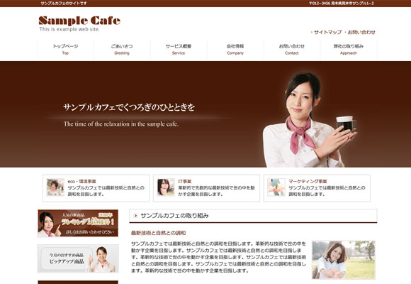 カフェ向けのデザインのホームページテンプレートです。カフェや喫茶店、その他の飲食店でもご利用頂けるデザインとなっています。