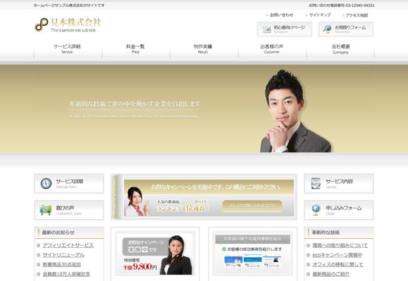 シックなデザインのホームページテンプレートです。3カラムのレイアウトですのでたくさんの情報を記載する必要があるサイトに最適です。企業サイトとしてはもちろん、学校・学習塾など教育系、医療系などでも幅広く使えるデザインです。