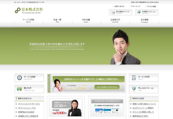 シックなデザインのホームページテンプレートです。3カラムのレイアウトですのでたくさんの情報を記載する必要があるサイトに最適です。企業サイトとしてはもちろん、学校・学習塾など教育系、医療系などでも幅広く使えるデザインです。