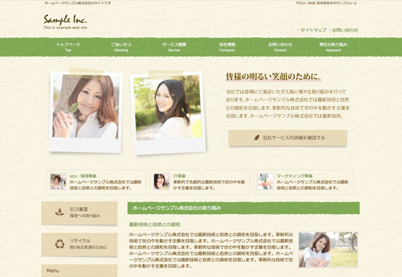 自然な質感のホームページテンプレートです。ECOを連想させるようなデザインですので、環境に取り組む企業サイトなどに最適です。