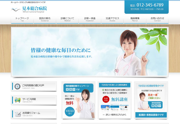 クリニック向けのデザインのホームページテンプレートです。病院や歯科医院・歯医者、薬局などの医療機関に最適なデザインです。