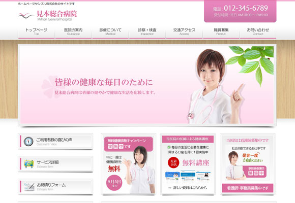 クリニック向けのデザインのホームページテンプレートです。病院や歯科医院・歯医者、薬局などの医療機関に最適なデザインです。