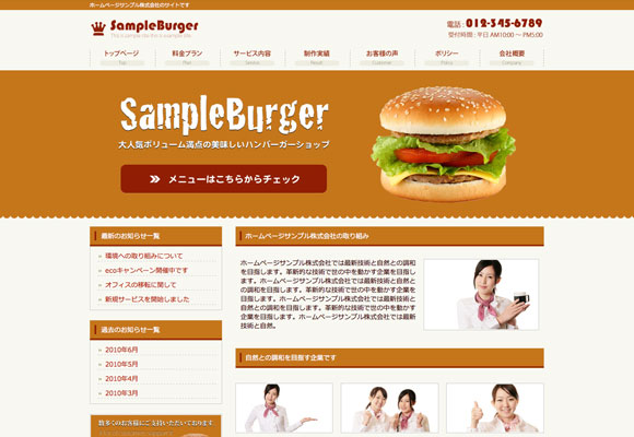 ハンバーガーショップ向けのホームページテンプレートです。ハンバーガーショップ以外でもカフェやレストランなどでもご利用頂けるデザインとなっております。