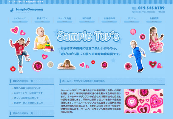 子供向けのサービスを行うサイト用のテンプレートです。ポップでかわいいデザインですので保育園・幼稚園やおもちゃなどを取り扱うサイトに最適です。