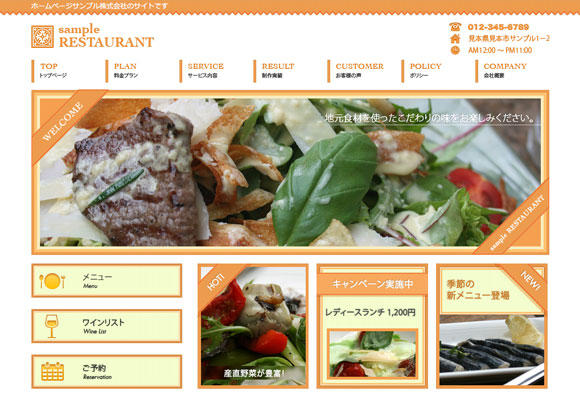 レストラン向けのホームページテンプレートです。カフェ等の飲食店でもご利用頂けるデザインとなっております。