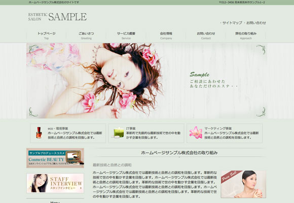 エステ系のデザインのホームページテンプレートです。エステ以外にもネイルサロンなどの美容系のサイトでご利用いただけます。