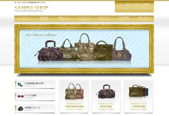 ショップ向けのデザインのホームページテンプレートです。アパレル系や雑貨店、その他美容室・美容院・エステなどでもご利用頂けるホームページテンプレートとなっております。